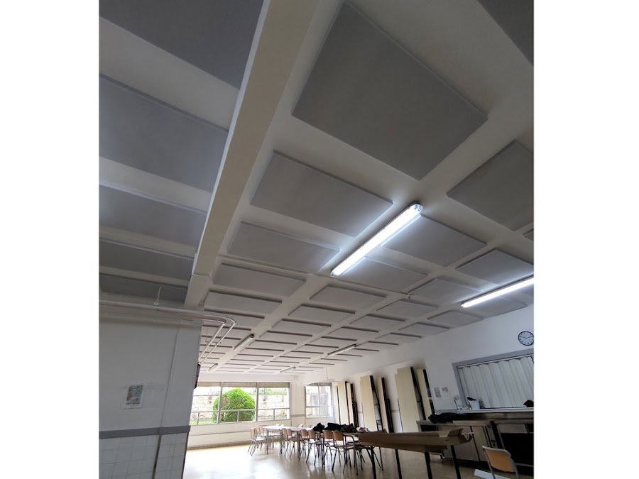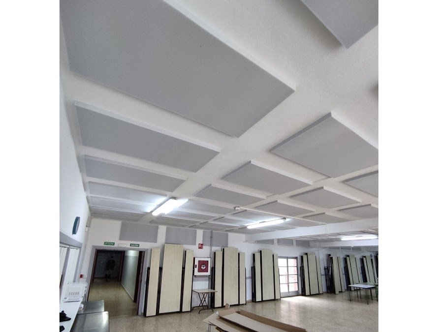 Tras realizar el estudio básico con hoja de cálculo para conocer el tiempo de reverberación, definimos el tratamiento a realizar. Aplicamos islas adheridas a forjado, no interfieren en instalaciones ya existentes y evitamos así la intervención de otros gremios.