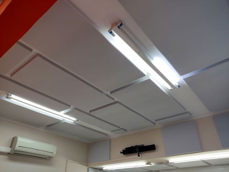 Con las características de estos espacios y con los objetivos marcados, decidimos adherir islas rectangulares en techos y otras islas en zonas altas de los tabiques, aunando eficacia y función estética.